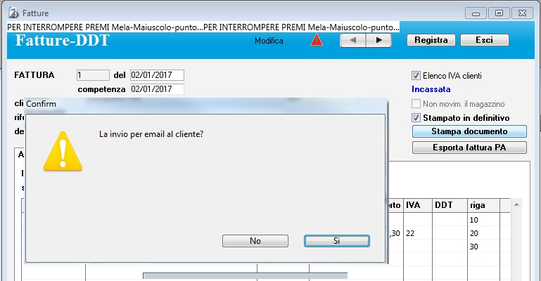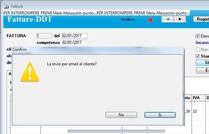 In questa versione è stata introdotta per prima cosa la possibilità di salvare in pdf per default. Una volta che il programma sa di aver prodotto il pdf allora opzionalmente questo può essere spedito direttamente al cliente utilizzando un modello preimpostato che comprende Soggetto, testo, eventuali utenti in copia e copia nascosta (Bcc) e allegati.